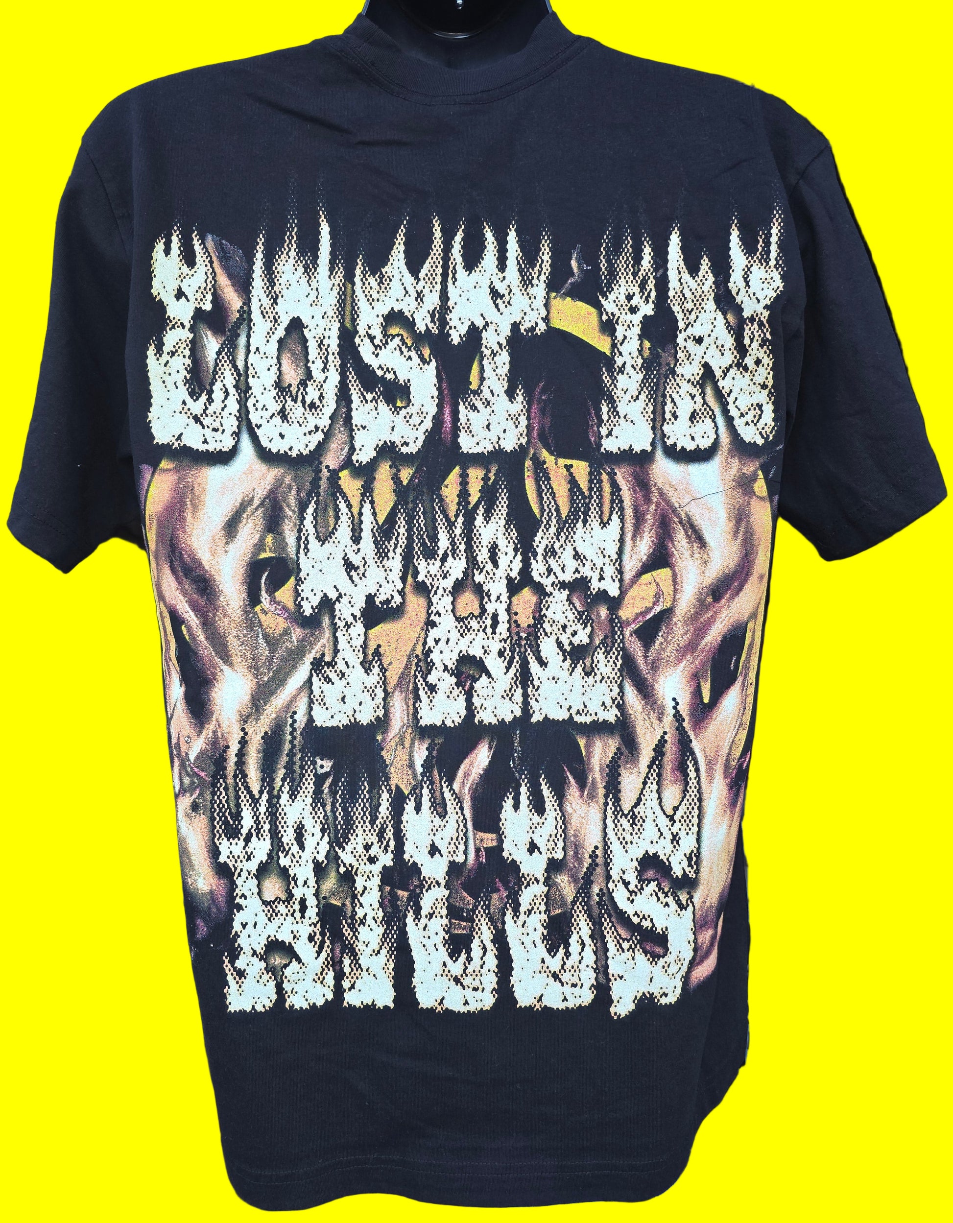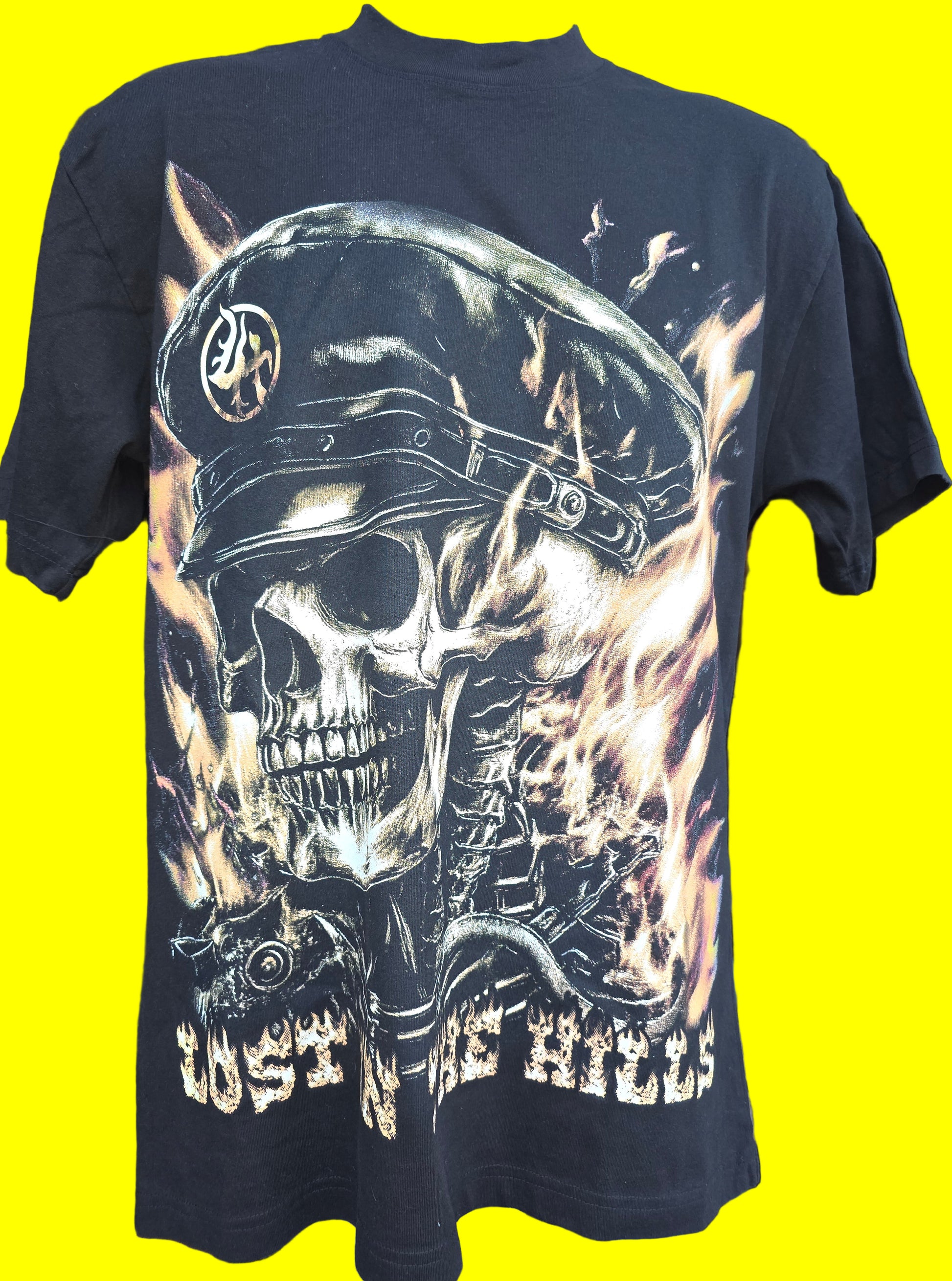 The shirt features a large graphic of a skull wearing a beret with flames surrounding it, and the text "LOST IN THE HILLS" on the front.