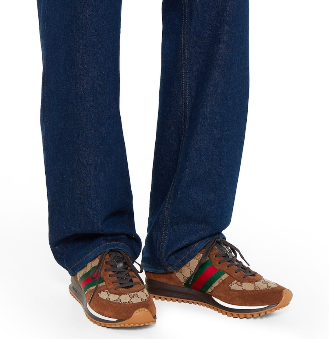 In the Fall Winter 2025 collection, the Gucci Re-Motion sneaker blends classic with contemporary elements. Crafted from GG canvas, the model is completed with the signature green and red Web. The lightweight, flexible outsole has gone through a special treatment to create a retro appeal.