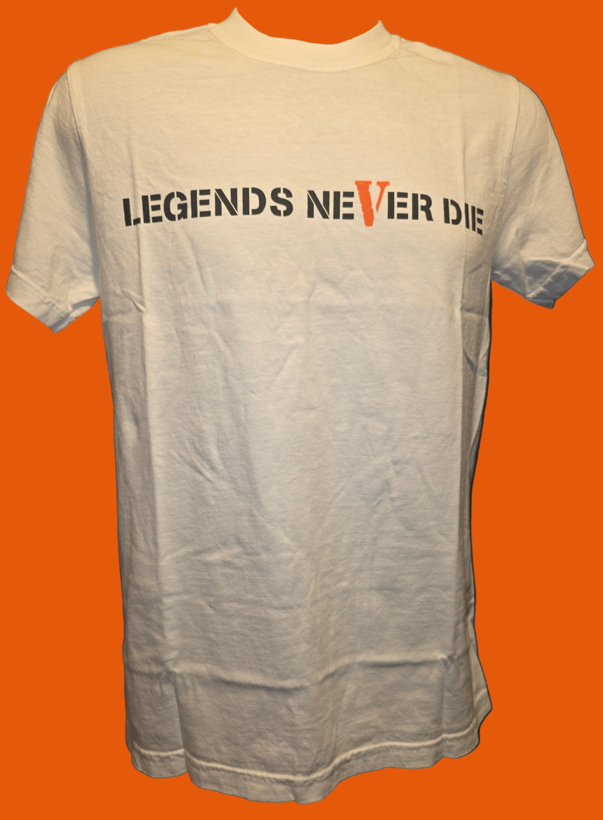The shirt is a collaboration between the streetwear brand Vlone and the late rapper Juice WRLD. The design on the back of the shirt features a large orange Vlone "V" logo with the number "999" incorporated into it. This collection of merchandise was released in 2020 as part of the promotion for Juice WRLD's posthumous album, Legends Never Die.